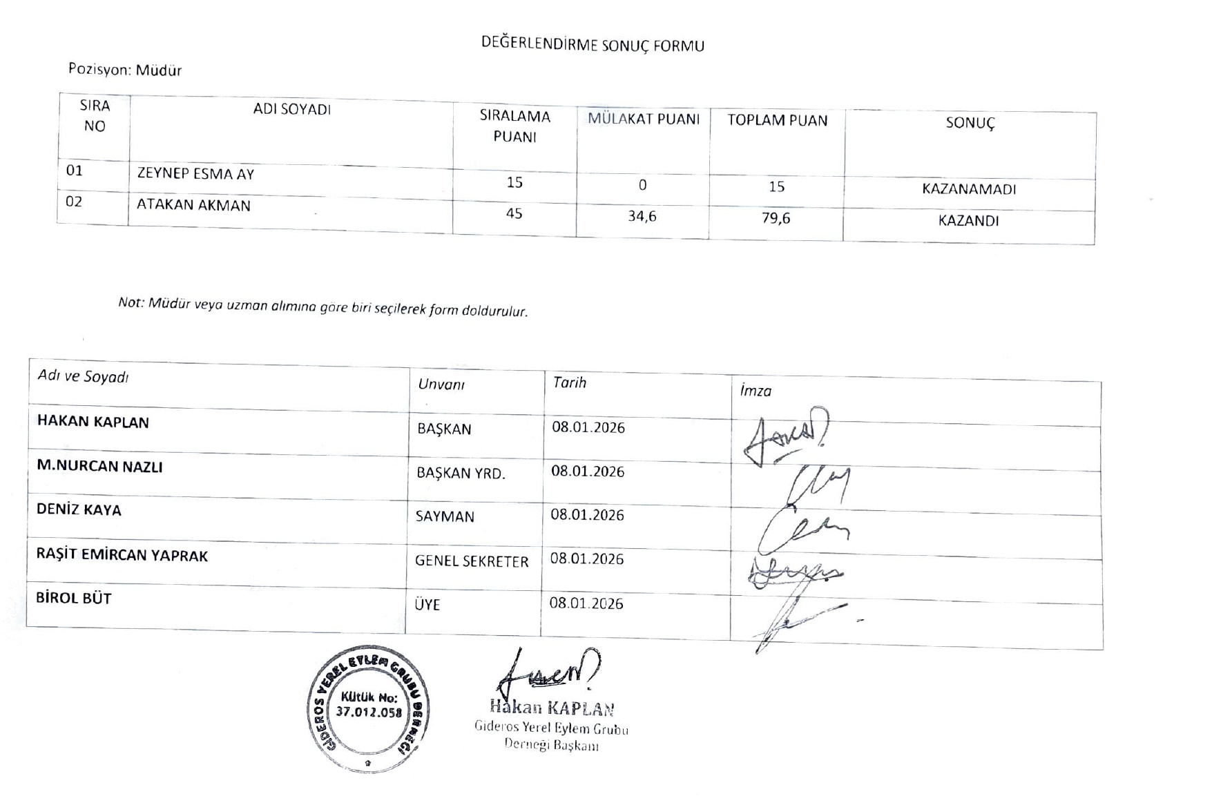 Derneğimize daha önce ilana çıkılan personel (müdür) alımına ilişkin mülakat yapılmış olup değerlendirmeye ilişkin sonuç tutanağı yukarıda yayınlanmıştır. Derneğimize ve başarılı olan adayımıza hayırlı olsun...