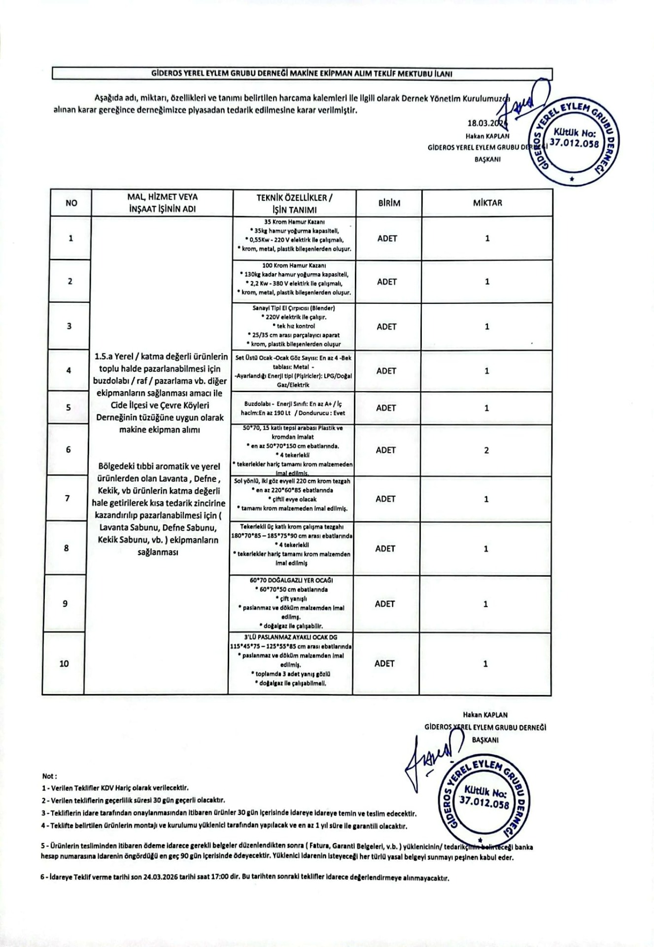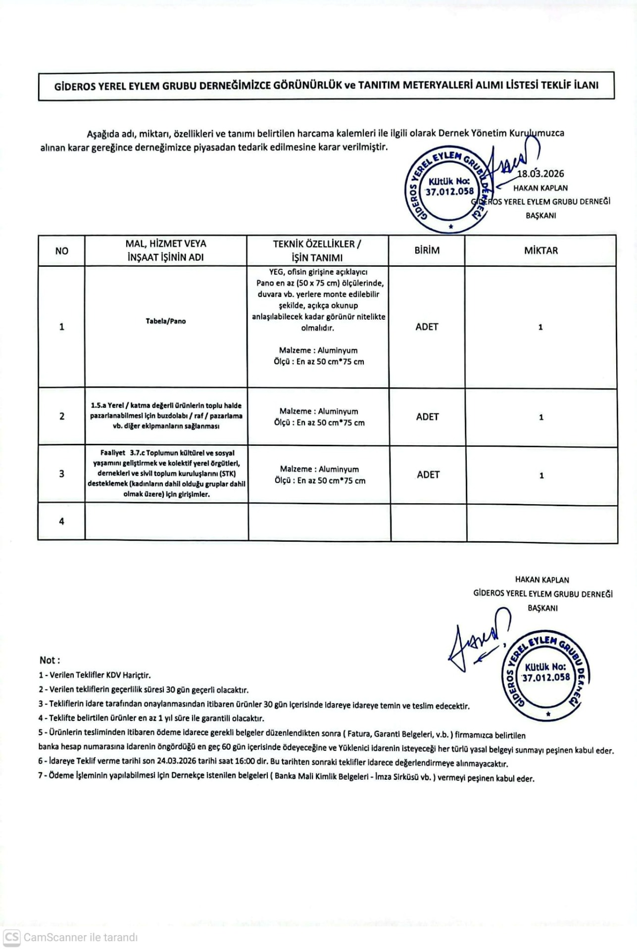 İlan Aşağıda adı, miktarı, özellikleri ve tanımı belirtilen kalemleri ile ilgili olarak Dernek Yönetim Kurulumuzca alınan karar gereğince derneğimizce piyasadan tedarik edilmesine karar verilmiştir.